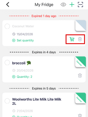 - Once an item is expired you can either delete it or add them back to your grocery list