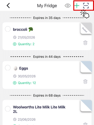 - Tap the barcode scan icon on the top right to scan items and add them to your pantry or fridge list in seconds.