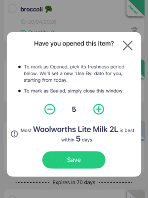 - On the top right of each item you can mark as “Open” or “Sealed” which you can determine the use by date manually or based on our recommended use by date for freshness